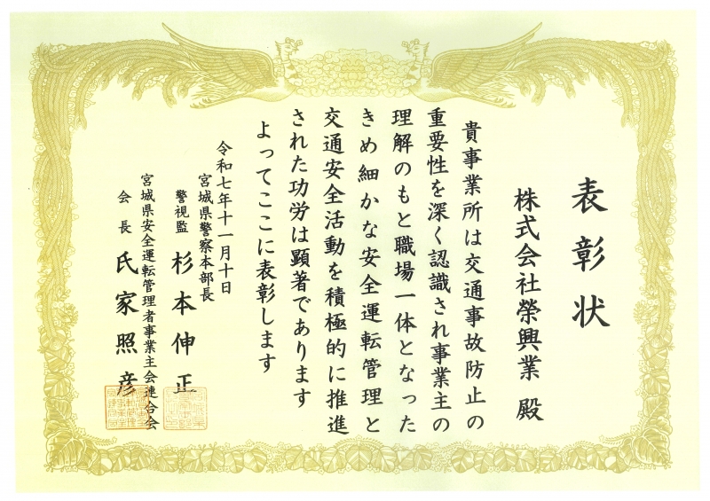 このたび令和7年度安全優良事業所表彰を受賞いたしました。